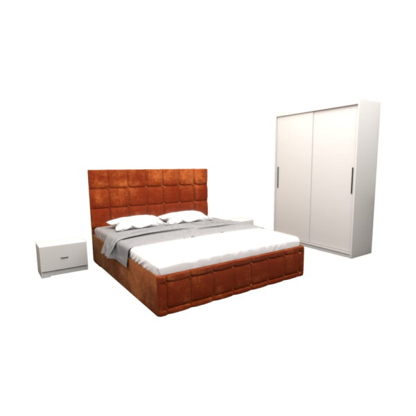 Set Dormitor Regal cu Pat Tapitat Caramiziu stofa cu dulap usi glisante Alb fara oglinda si fara comoda Tv